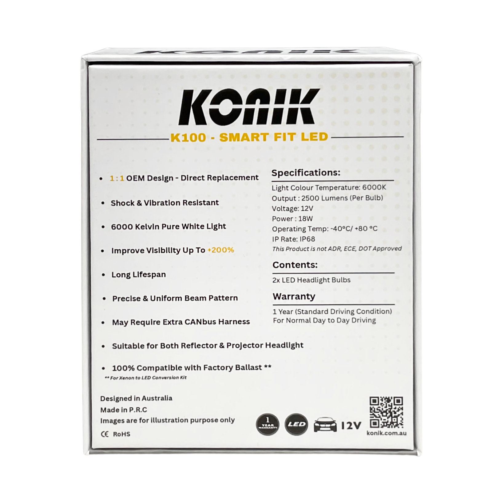 SMART-FIT LED KITKONIK K100 1:1 Smart-Fit 6000K White H1 LED Conversion Kit